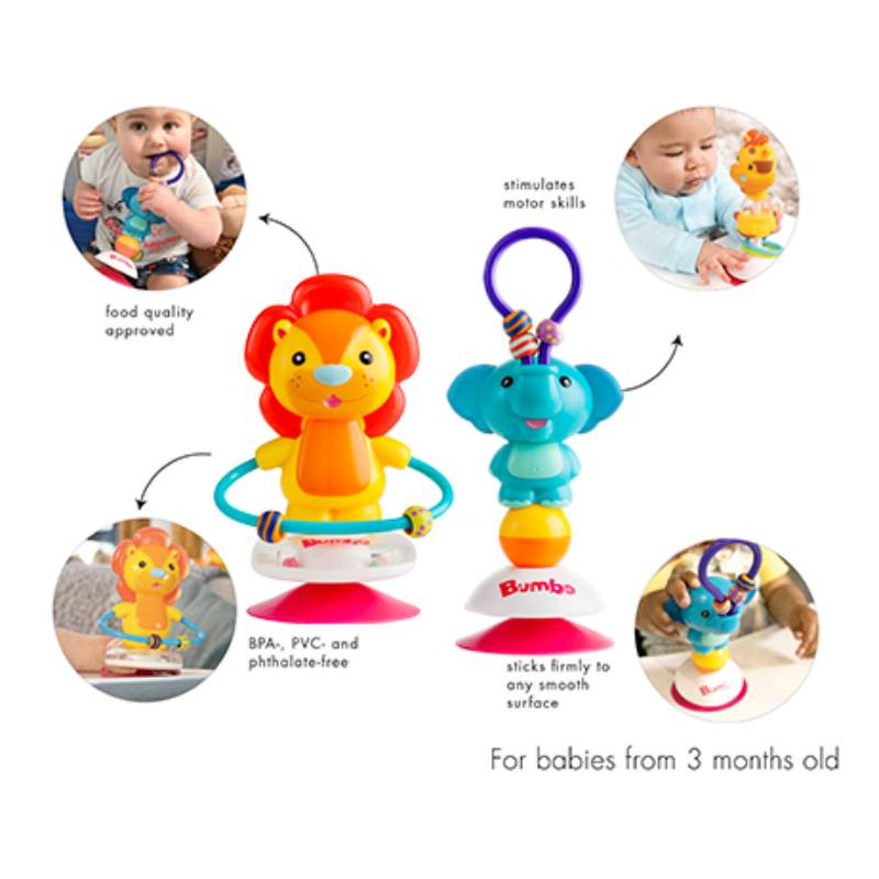 VENTOSA DE FIXAÇÃO FORTE: A ventosa adere solidamente a qualquer superfície lisa e não porosa, como bandejas de cadeiras altas, mesas, janelas ou os assentos Bumbo (Floor Seat e Multi Seat). Não cai, não desliza e não vai parar ao chão.