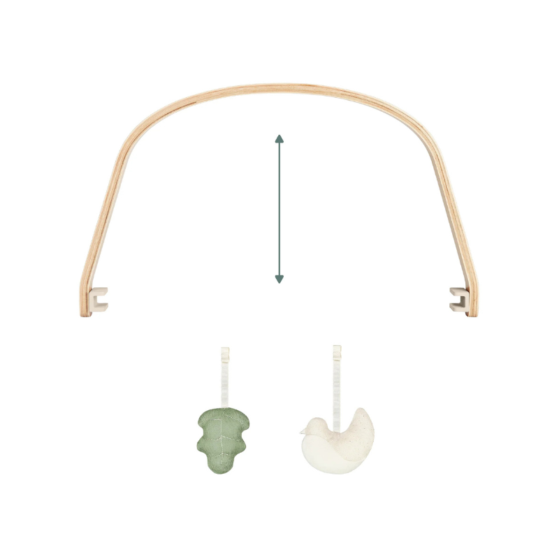 Arco de jogos compatível com espreguiçadeira Babymoov Swoon Flow. Brinquedos sensoriais (papel crepitante, chocalho, cores contrastantes) ao alcance do bebé. Estrutura em madeira FSC® e tecidos reciclados/orgânicos. Estimula a motricidade fina desde o nascimento.