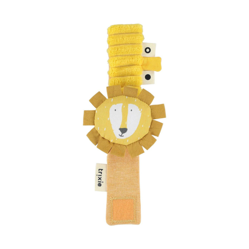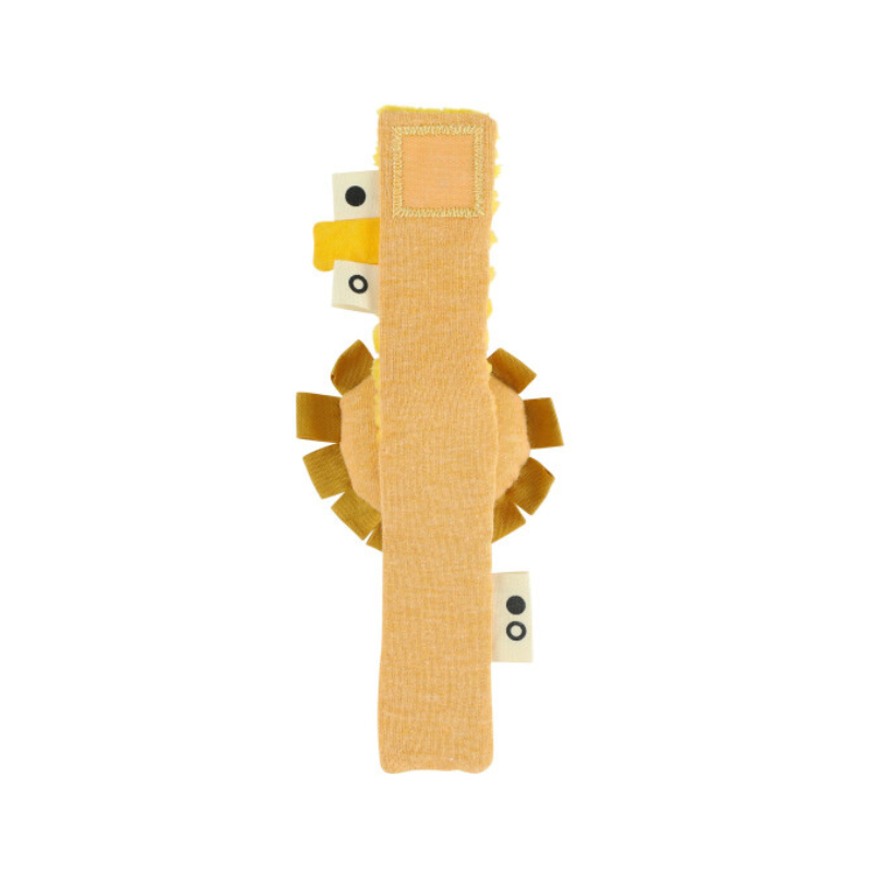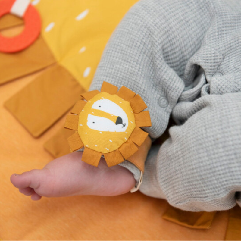 Pulseira de atividades TRIXIE com chocalho em forma de leãozinho. Cada movimento ativa o som, estimulando a audição e a coordenação. Confeccionada em 100% algodão orgânico com enchimento reciclado. Ajustável ao pulso ou tornozelo. Presente sustentável e adorável.