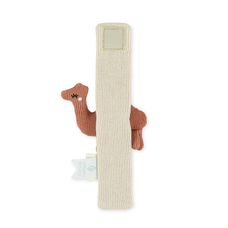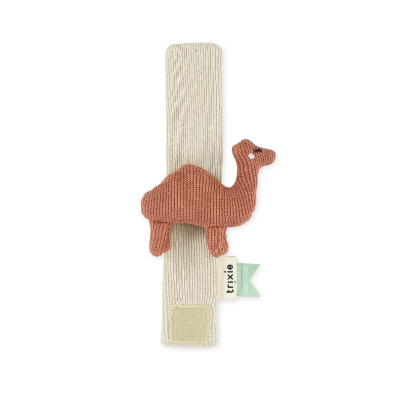 Pulseira de atividades TRIXIE com chocalho em forma de camelo. Cada movimento ativa o som, estimulando a audição e a coordenação. Confeccionada em 100% algodão orgânico com enchimento reciclado. Ajustável ao pulso ou tornozelo. Presente sustentável e adorável.