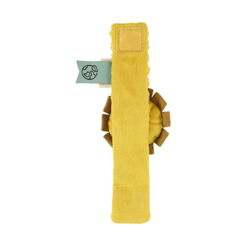 Pulseira de atividades TRIXIE com chocalho em forma de leãozinho. Cada movimento ativa o som, estimulando a audição e a coordenação. Confeccionada em 100% algodão orgânico com enchimento reciclado. Ajustável ao pulso ou tornozelo. Presente sustentável e adorável.
