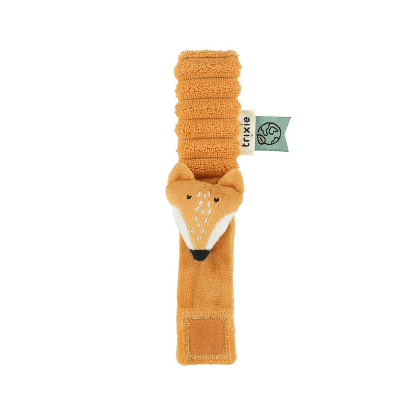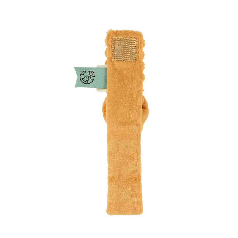Pulseira de atividades TRIXIE com chocalho em forma de raposa. Cada movimento ativa o som, estimulando a audição e a coordenação. Confeccionada em 100% algodão orgânico com enchimento reciclado. Ajustável ao pulso ou tornozelo. Presente sustentável e adorável.
