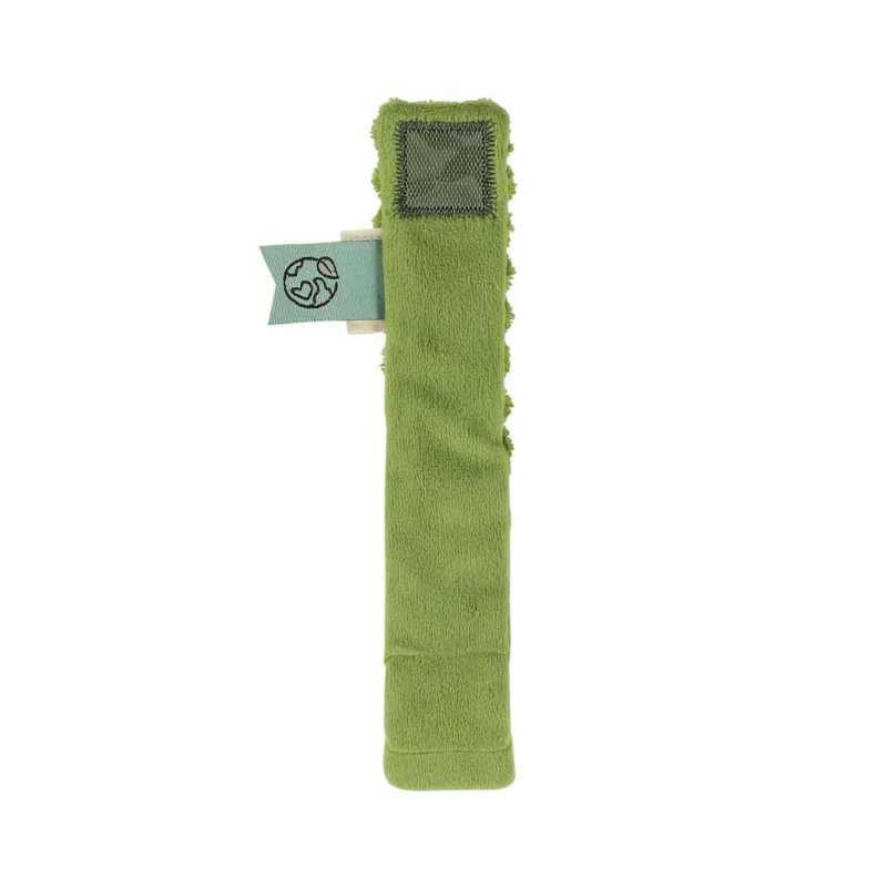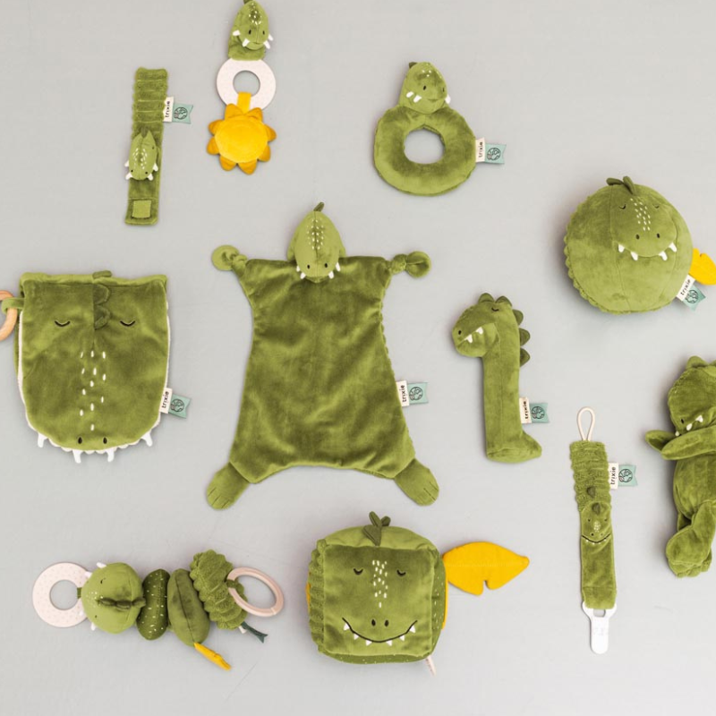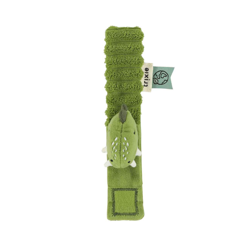 Pulseira de atividades TRIXIE com chocalho em forma de Dinossauro. Cada movimento ativa o som, estimulando a audição e a coordenação. Confeccionada em 100% algodão orgânico com enchimento reciclado. Ajustável ao pulso ou tornozelo. Presente sustentável e adorável.