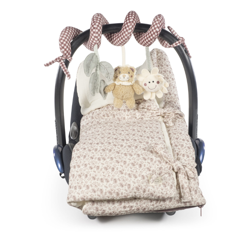 Fabricado com materiais ultra-suaves como veludo e peluche, inclui diferentes elementos pendentes com texturas, formas e sons, que incentivam o desenvolvimento sensorial, motor e cognitivo do bebé.