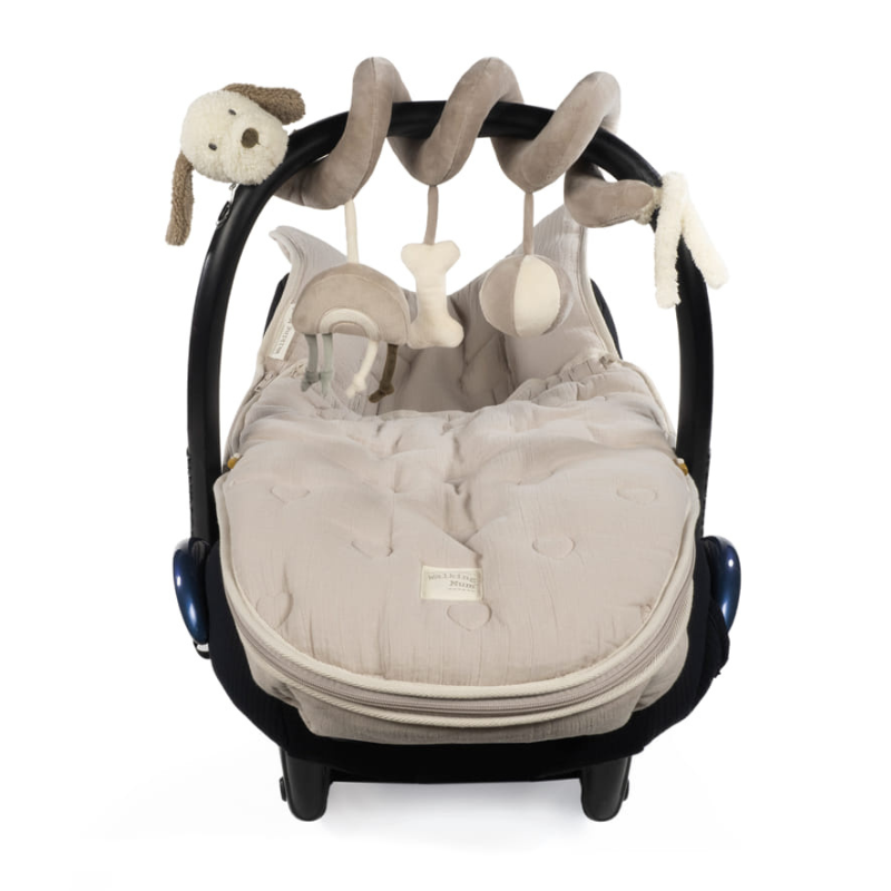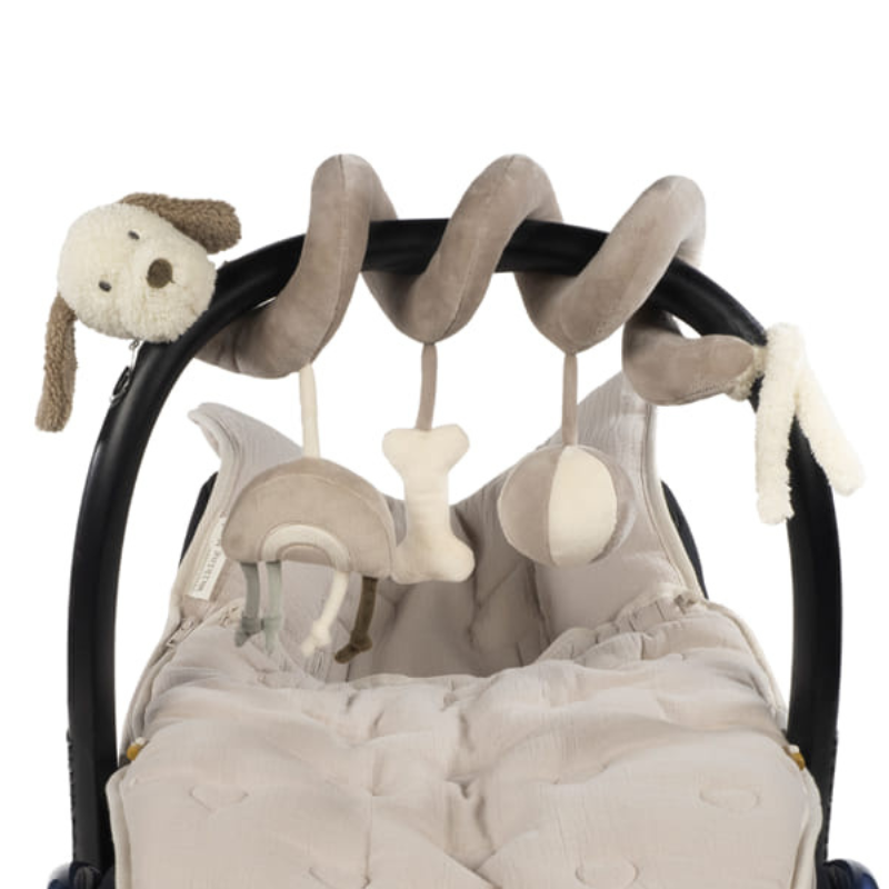 Espiral didática Walking Mum Sintra com cãozinho bege, texturas, sons e formas para estimular o bebé. Pendura no carrinho ou cadeira auto, segura e lavável à máquina.
