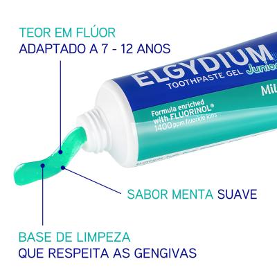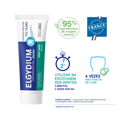 A Pasta de Dentes Elgydium Júnior Menta Suave protege os dentes definitivos contra as cáries, formulada com Fluorinol® e 96% de ingredientes naturais, garantindo uma limpeza eficaz e suave.