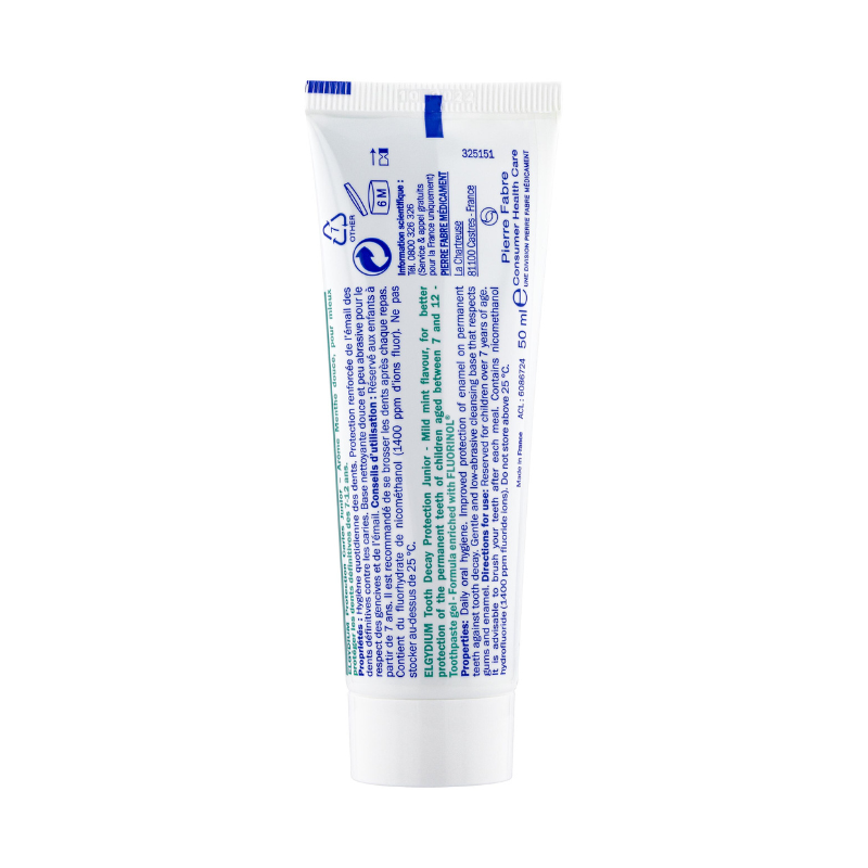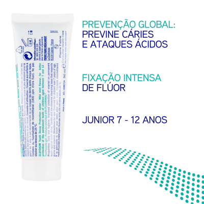 A pasta dentífrica Elgydium Junior Tutti Fruti Emoji, para crianças de 7 a 12 anos, contém Fluorinol® com 1400ppm de flúor, oferecendo proteção reforçada contra cáries e fortalecendo o esmalte dos dentes definitivos.