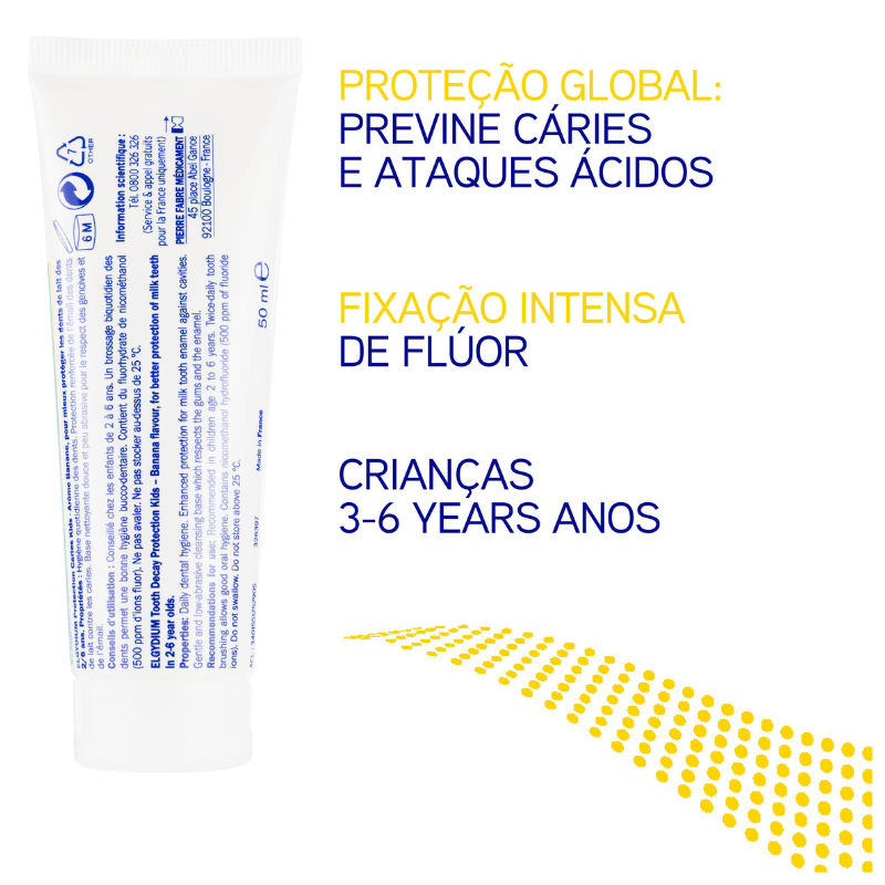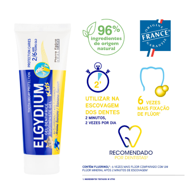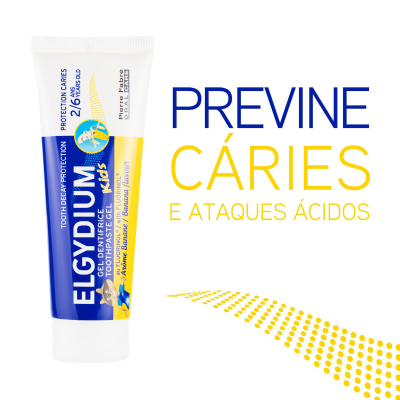 A Elgydium Kids Pasta de Dentes dos 2 aos 6 anos é formulada com Fluorinol® para proteger o esmalte dos dentes de leite contra cáries.