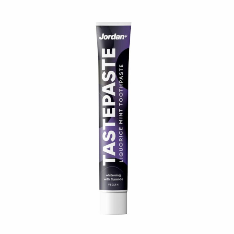Jordan Tastepaste Pasta Dentes Sabor Alcaçuz e Menta Fresca com efeito branqueador e proteção de flúor contra cáries.