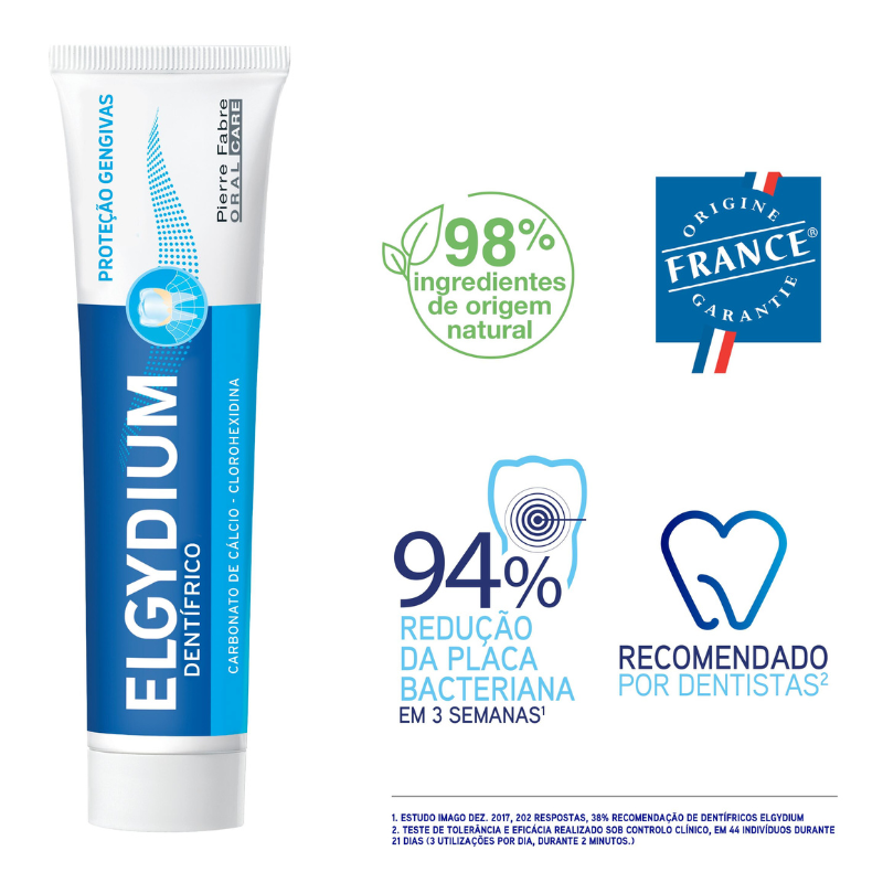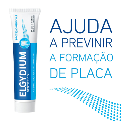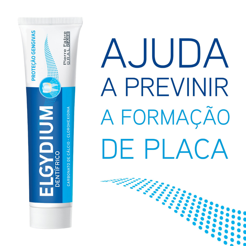 A pasta dentífrica Elgydium Proteção Gengivas reduz a placa bacteriana em 50% após 3 semanas de uso.