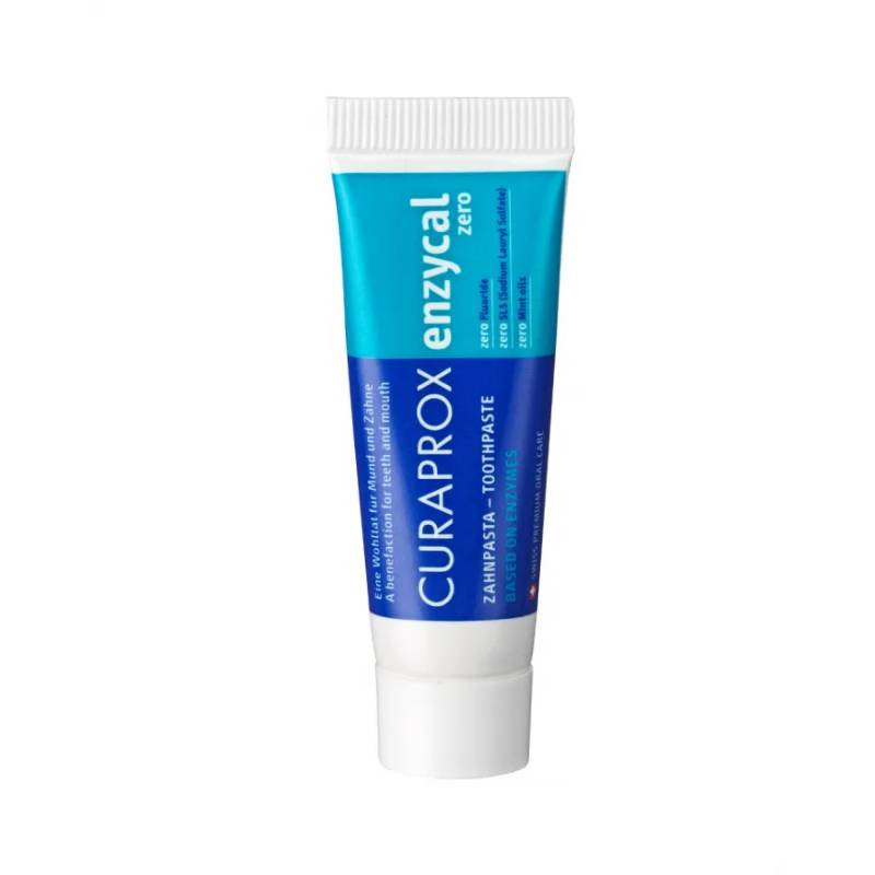 CURAPROX Enzycal Zero: pasta de dentes sem flúor com 3 enzimas naturais que reforçam as defesas da saliva. Sem óleos de menta, ideal para tratamentos homeopáticos. RDA 60 (abrasividade moderada). Fabricada na Suíça.