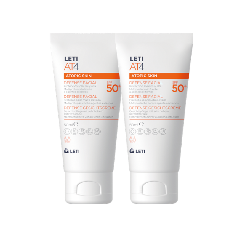 Este pack inclui 2 unidades de 50ml LETIAT4 Defense Facial SPF50+, um cuidado diário que protege e reforça a barreira cutânea da pele atópica e sensível.