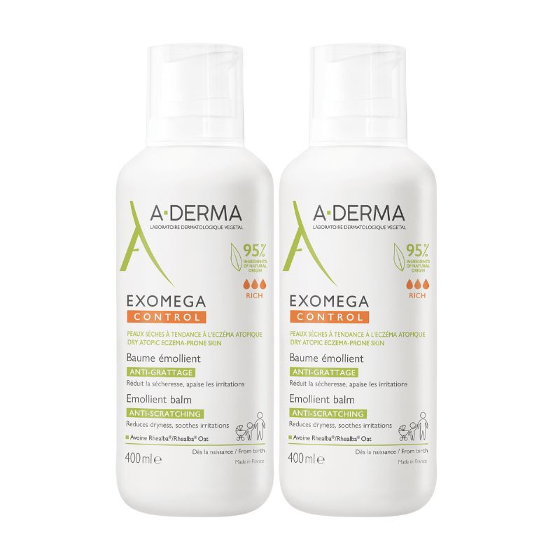 A-Derma Exomega Control Bálsamo Emoliente é um pack composto por duas embalagens de 400ml. A-Derma Exomega Control Bálsamo Emoliente hidrata e acalma o rosto e corpo da para pele seca e com tendência atópica.