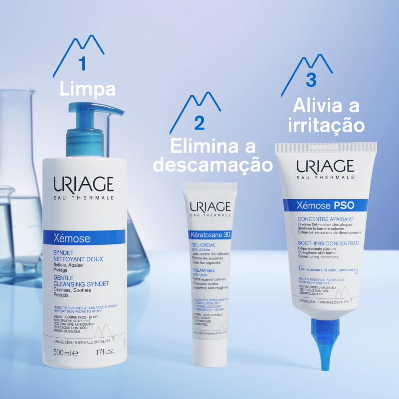 Xémose PSO Concentrado Apaziguante da Uriage é o primeiro cuidado complementar com mecanismo de ação patenteado especialmente desenvolvido para a pele com psoríase. Com uma fórmula inovadora e dois complexos dermatológicos exclusivos, este concentrado ajuda a reduzir até 90% das placas enquanto alivia o desconforto cutâneo.