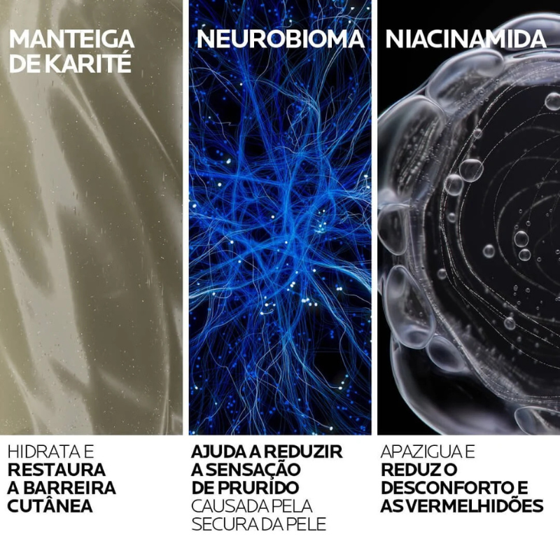 TECNOLOGIA DO NEUROBIOMA: Tecnologia de ponta inspirada em pesquisa avançada em neurociência que relaciona o microbioma e a perceção neurossensorial do prurido. Ajuda a reduzir a sensação de comichão.