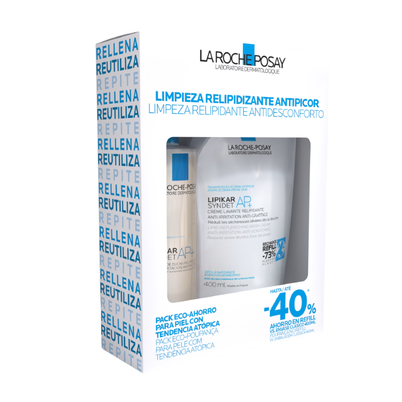 LIPIKAR SYNDET AP+ REFILL 400ml (Embalagem económica de recarga): O mesmo produto, numa embalagem flexível que utiliza até 50% menos plástico , permitindo reutilizar a bomba doseadora original.
