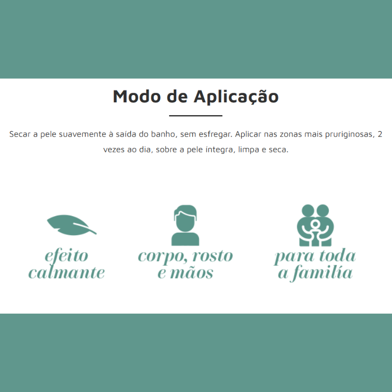 Secar a pele suavemente à saída do banho, sem esfregar. Aplicar nas zonas mais pruriginosas, 2 vezes ao dia, sobre a pele íntegra, limpa e seca.