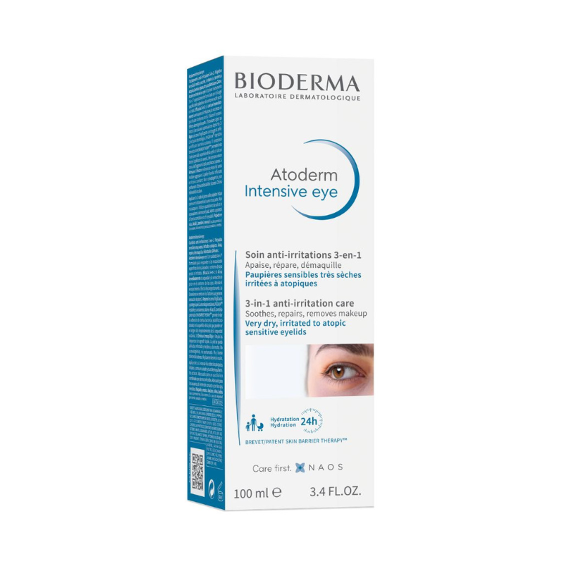 Formulado para eczema da pálpebra Bioderma Atoderm Intensive Eye, acalma, repara e remove a maquilhagem, aliviando a comichão em até -95% em peles muito secas e com tendência atópica.