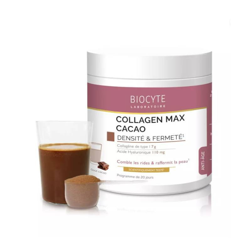 Biocyte Collagen Max Cacau Pó 260g apresenta uma fórmula ultraconcentrada em Colagénio Verisol e Ácido Hialurónico que preenche as rugas e confere firmeza à pele.