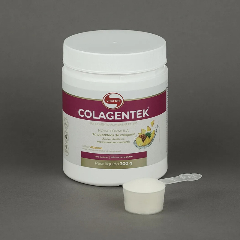 Colagentek® Vitafor é um suplemento de colágenio hidrolisado referência em qualidade, sabor e praticidade. Com 9g de colágenio por porção, aliado a vitaminas e minerais essenciais, oferece suporte completo à formação de colágenio, saúde da pele, cabelos, unhas, sistema imunitário e metabolismo energético.