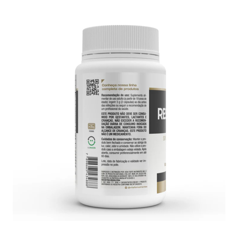Resveratrol Plus com 60 cápsulas. Fórmula completa com trans-resveratrol (165mg), ácido hialurónico (120mg), Q10 (50mg), vitaminas B3, B12, biotina e zinco. Antioxidante poderoso para envelhecimento saudável, pele, cabelo e unhas.