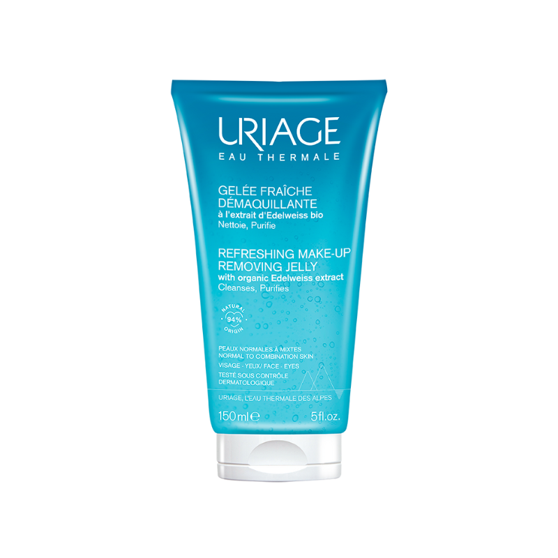 Gel Fresco Desmaquilhante Uriage limpa suavemente rosto e olhos, removendo maquilhagem e impurezas. Com 94% de ingredientes naturais, refresca, purifica e reduz o repuxo, ideal para peles mistas a oleosas.