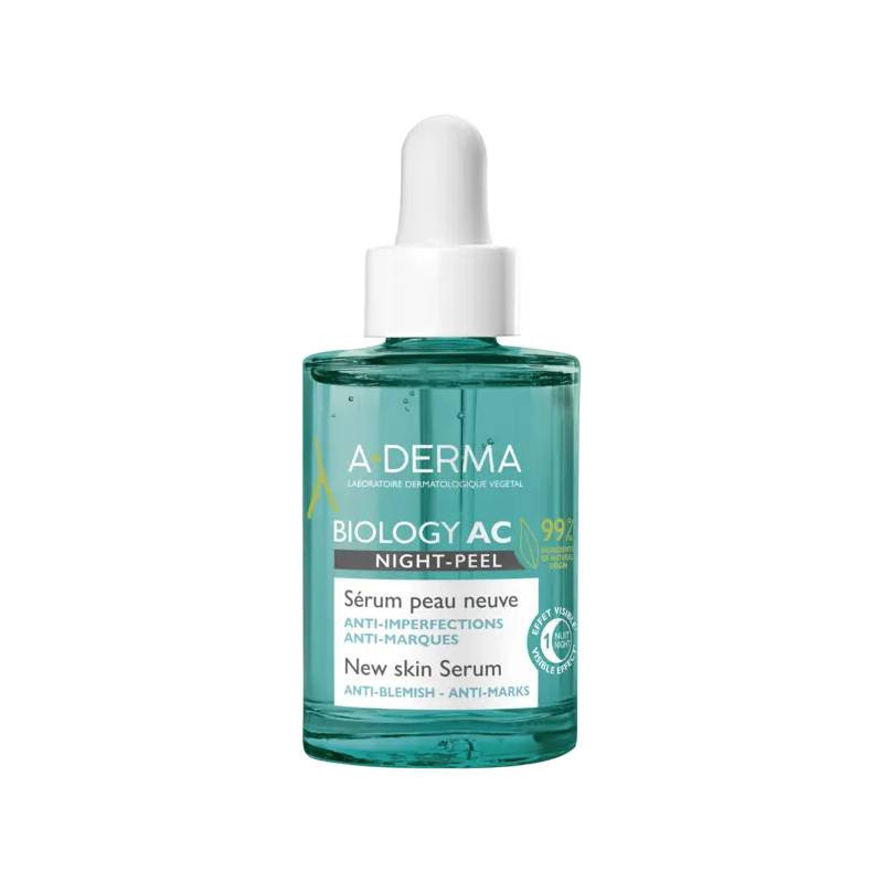 A-Derma Biology AC Night-Peel Sérum alisa a pele, desobstrui pontos negros e ajuda a eliminar manchas e marcas persistentes.