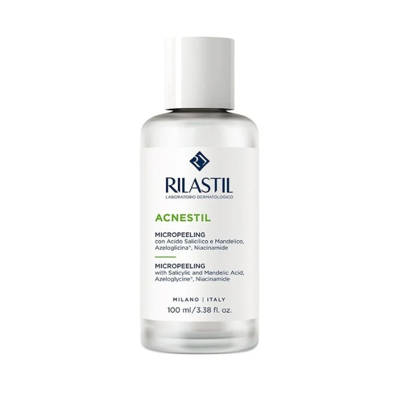 Rilastil Acnestil Micropeeling é uma loção esfoliante suave para rosto e corpo, sem enxaguamento, co-adjuvante no tratamento de peles com tendência acneica.