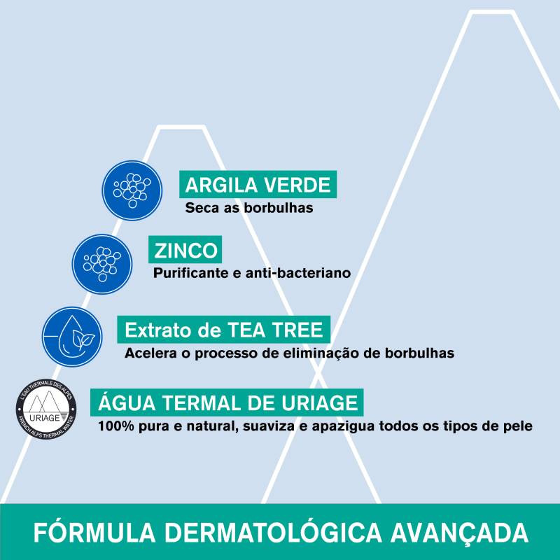 Sua fórmula exclusiva combina o poder purificante do Extrato de Xisto, a ação absorvente da Argila Verde e o efeito regulador do Zinco, atuando diretamente nas imperfeições. Enriquecida com Água Termal de Uriage, esta pasta proporciona um efeito calmante local que reduz vermelhidão e desconforto.