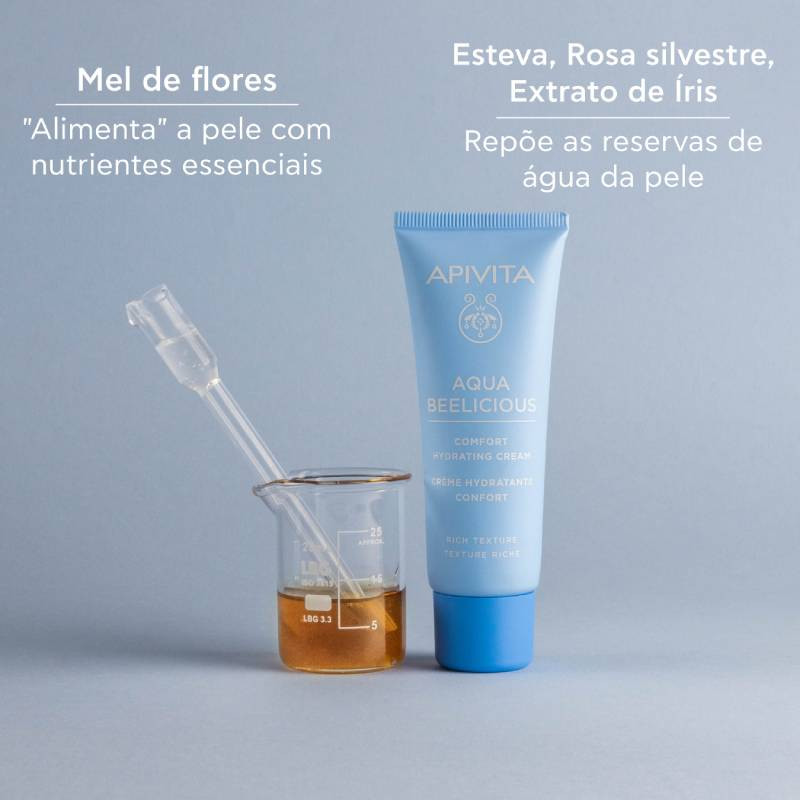 Apivita Aqua Beelicious Comfort Creme Rico 40ml para pele normal a seca, oferece hidratação e frescura instantâneas e duradoras, com extrato de flores, mel, aloé e ácido hialurónico.