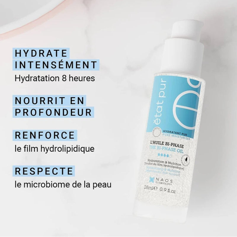 Descobre o Óleo Bifásico Etat Pur, um tratamento inovador que une a leveza da água ao poder nutritivo dos óleos numa única fórmula. A sua composição única inspira-se diretamente no filme hidrolipídico natural da pele, combinando uma fase aquosa e uma fase lipídica para uma hidratação completa e profundamente eficaz.