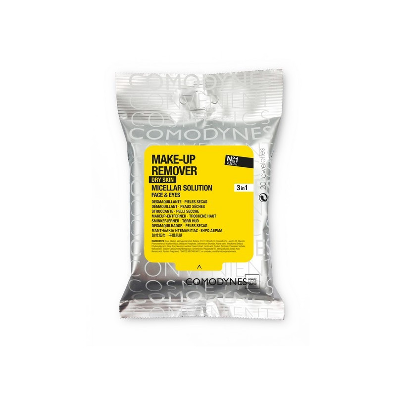 Comodynes Make-Up Remover Pele Seca 20Uni toalhitas desmaquilhantes micelares com aveia e flor de lótus para peles secas.