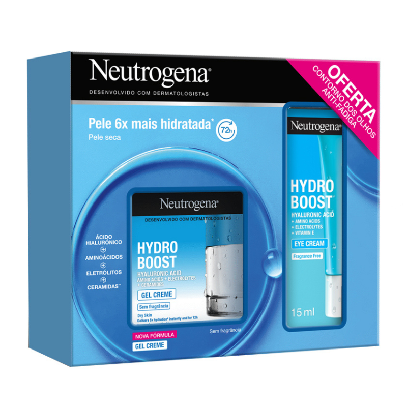 O coffret Neutrogena Hydro Boost Gel Creme + Contorno de Olhos é composto por um Gel Creme de 50 ml e um Contorno de Olhos de 15 ml.