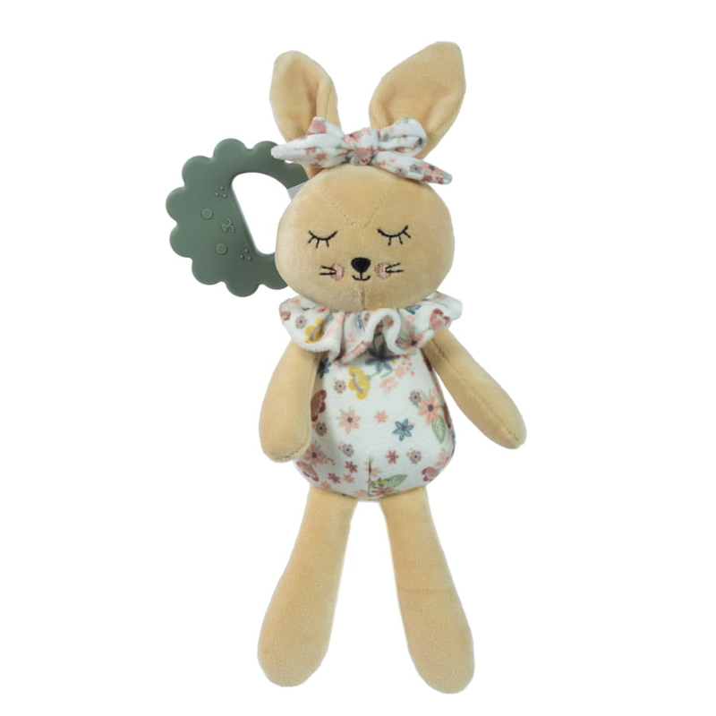Peluche coelho Pasito a Pasito Mr. & Mrs. Rabbit Garden com mordedor em silicone. Orelhas com som de espelho e guiso no interior. Estimula os sentidos e acalma as gengivas. Isento de BPA e ftalatos. 26x13x5,5 cm.