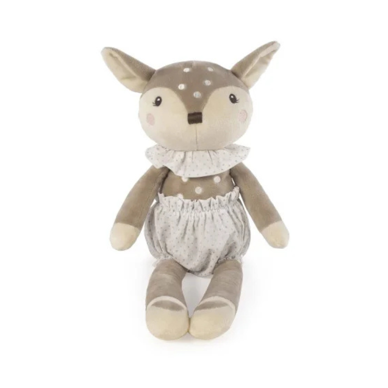 O veado que cabe nos braços e aquece o coração. Confeccionado em veludo e peluche ultra macio, com 38 cm de ternura. Olhos bordados, sem peças pequenas. Perfeito para abraçar, acalmar e acompanhar o bebé desde os primeiros dias. (+0 meses). Lavável à máquina.