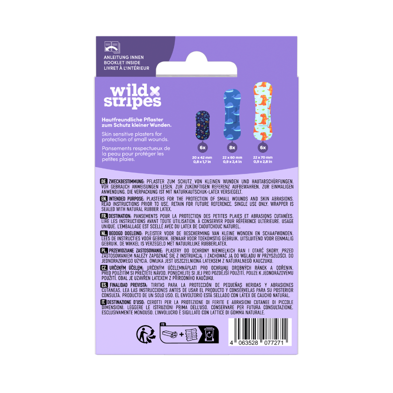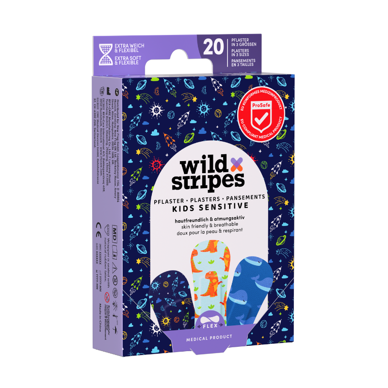 Com desenhos divertidos inspiradas no espaço, os Pensos Wild Stripes Kids Sensitive Space são perfeitos para a pele sensível das crianças maiores de 3 anos, oferecendo proteção contra pequenas feridas, cortes e abrasões.