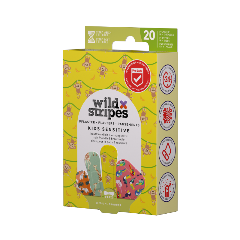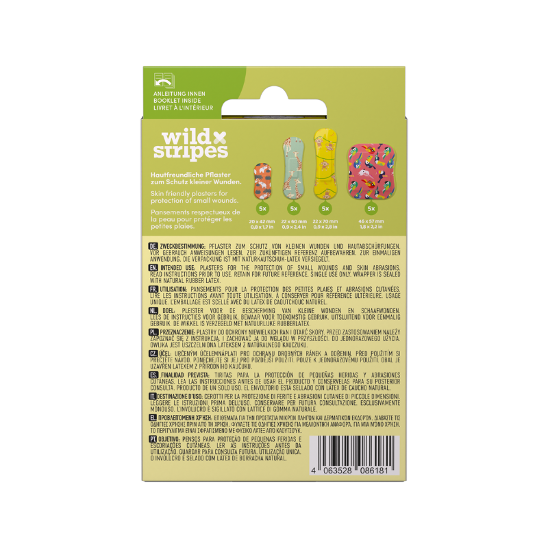 Transforma cada "dói-dói" numa aventura divertida! Os Pensos Wild Stripes Kids Jungle foram criados a pensar na pele sensível das crianças. Com um design colorido da selva que conquista os mais pequenos, estes pensos oferecem proteção eficaz para cortes, feridas e arranhões.