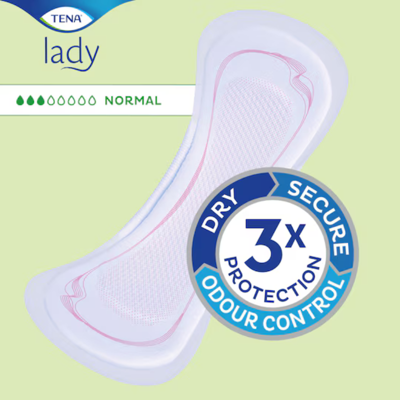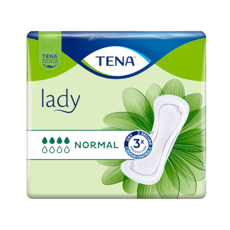 TENA Lady Normal Pensos proteção feminina discreta e confortável para incontinência ligeira a moderada. Tripla proteção contra perdas, odor e humidade. Embalagem com 24 unidades.