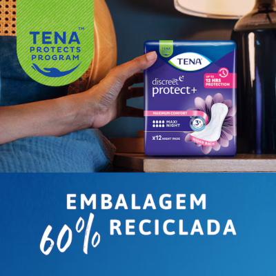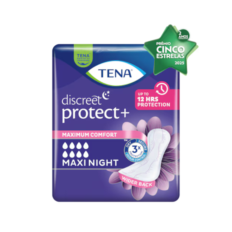 TENA Lady Discreet Maxi Night é um penso diário para mulheres com incontinência média a forte, ideal para proteção durante a noite. Com tecnologia Fresh Odour Control e embalagem individual.