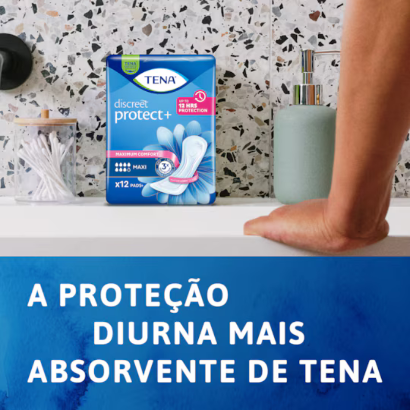 TENA Discreet Protect+ Maxi são pensos para incontinência intensa, com até 12 horas de proteção, zona InstaDRY™ para absorção imediata, conforto máximo e controle de odores.