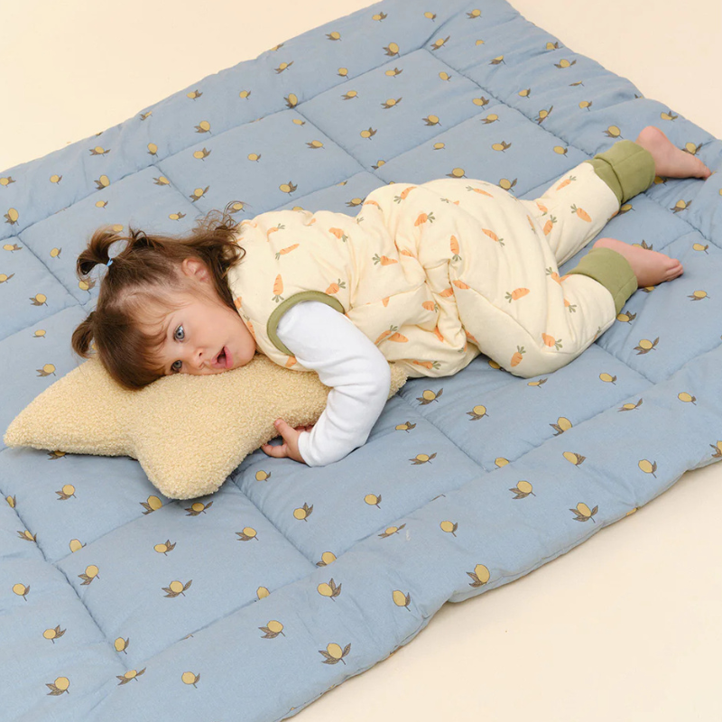 Mangas e meias, tudo numa só peça! Macacão de inverno quentinho para vestir sobre o pijama, com mangas integradas e sapatilhas antiderrapantes removíveis. Fecho de correr fácil de vestir. Ideal para temperaturas abaixo de 21ºC durante o sono ou a brincar. Em algodão sustentável e materiais reciclados.