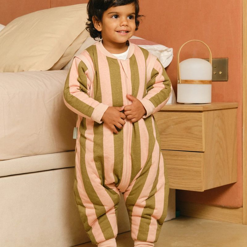 O macacão ideal para noites frescas e dias de brincadeira! Levemente acolchoado, TOG 1, próprio para temperaturas entre 21º e 24ºC. Veste-se sobre o pijama, oferecendo liberdade total de movimento. Perfeito para usar em cadeiras altas, carrinhos ou no chão. Este modelo não inclui meias. Feito com algodão sustentável e materiais reciclados.