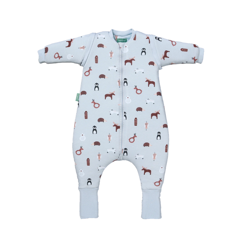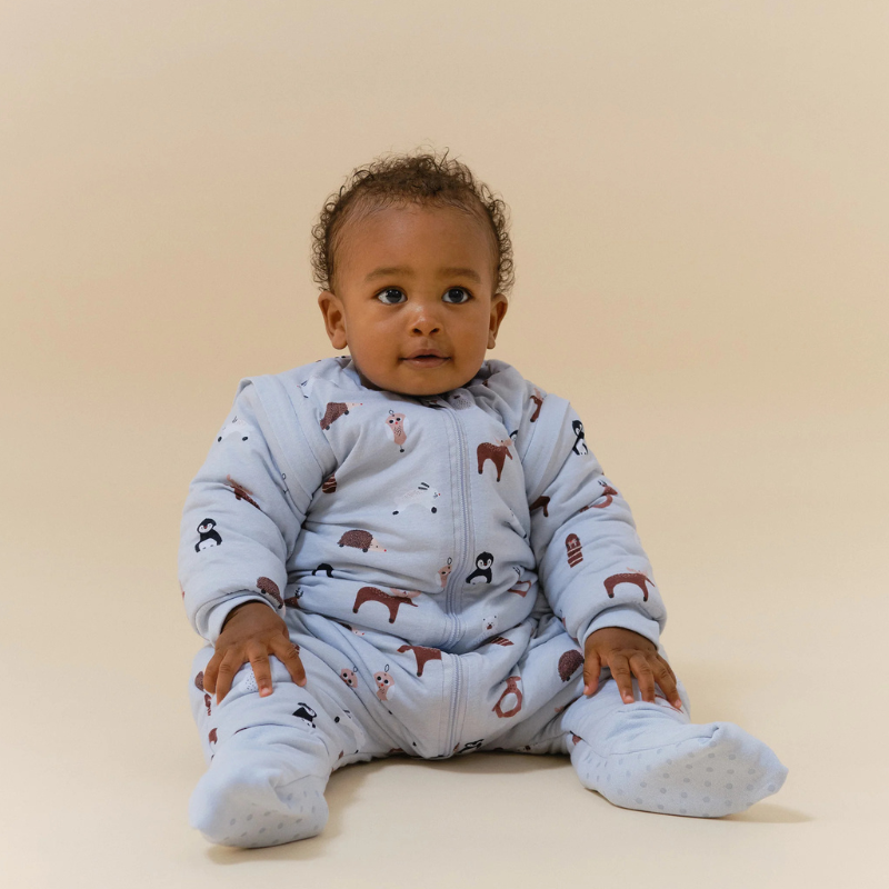 O macacão ideal para noites frescas e dias de brincadeira! Levemente acolchoado, TOG 1, próprio para temperaturas entre 21º e 24ºC. Veste-se sobre o pijama, oferecendo liberdade total de movimento. Perfeito para usar em cadeiras altas, carrinhos ou no chão. Este modelo não inclui meias. Feito com algodão sustentável e materiais reciclados.