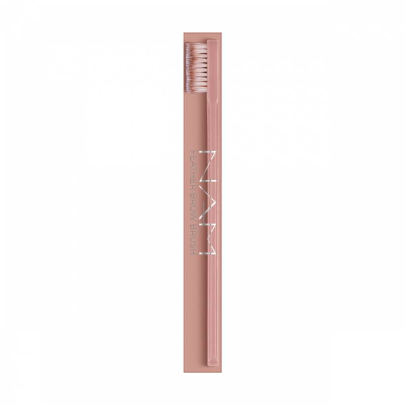 NAM Cosmetics Feather Brow Brush é um pincel de sobrancelhas, concebido para aplicação de pomadas e gel, para um efeito "sobrancelhas laminadas".