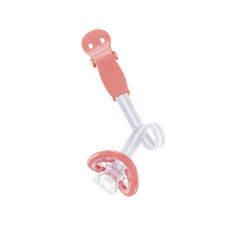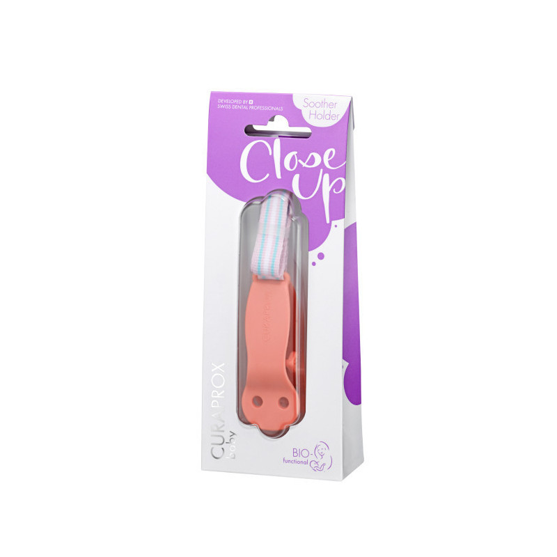 Produto prático: o clipe de suporte para chupetas Curaprox pode ser manipulado (aberto e fechado) apeas com uma mão. Para abrir, basta pressionar ao mesmo tempo os botões laterais.