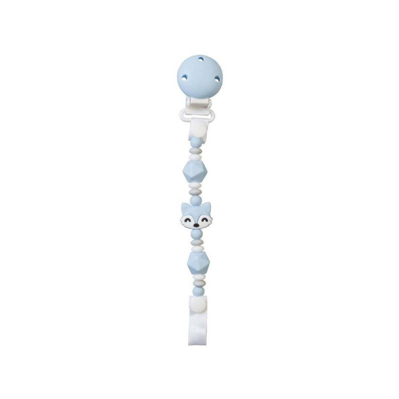 Saro Porta Chupeta Foxy Azul +0M é um acessório de silicone com clip ajustável, indicado para prender a chupeta do bebé.