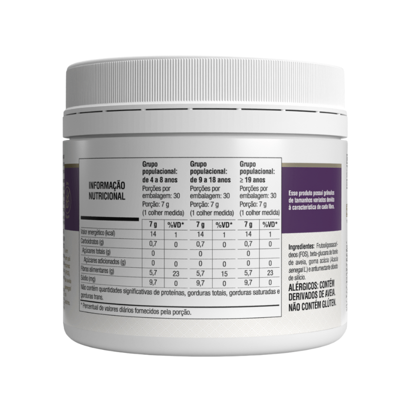 Frutooligosacarídeos (FOS), beta-glucana de farelo de aveia, goma acácia (Acacia senegal L.) e antiumectante dióxido de silício.