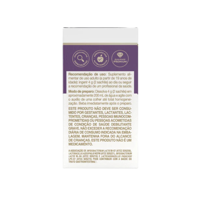Maltodextrina, amido modificado, Lactobacillus acidophilus NCFM (ATCC SD5221), Bifidobacterium lactis BI-07 (ATCC SD5220), Bifidobacterium lactis BL-04 (ATCC SD5219) e Lacticaseibacillus paracasei LPC-37 (ATCC SD5275). Não contém glúten.