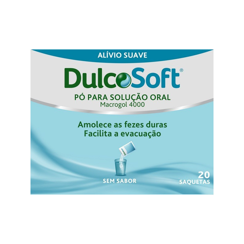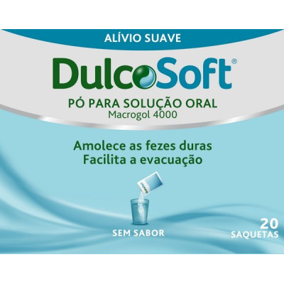 DulcoSoft Pó para Solução Oral é um dispositivo médico para alívio suave da prisão de ventre com fezes duras e secas, a partir dos 8 anos. Hidrata as fezes com a água do corpo, amolecendo-as para uma passagem fácil em 24-72 horas. Sem estimulantes, sabor neutro. 20 saquetas.