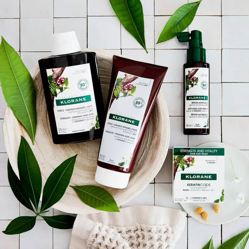 Klorane Champô Quinina e Edelvaisse BIO restabelece a força e a vitalidade do cabelo desvitalizado.